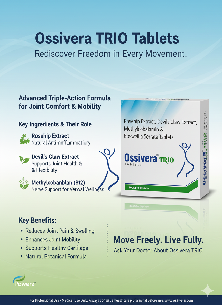 Ossivera Trio Tablets by Duvera are a scientifically formulated blend of herbal extracts and nutrients including Rosehip Extract, Devil’s Claw Extract, Methylcobalamin (Vitamin B12), and Boswellia Serrata. Designed to support joint health, these tablets help reduce inflammation, improve mobility, and relieve pain in conditions like arthritis and joint degeneration.